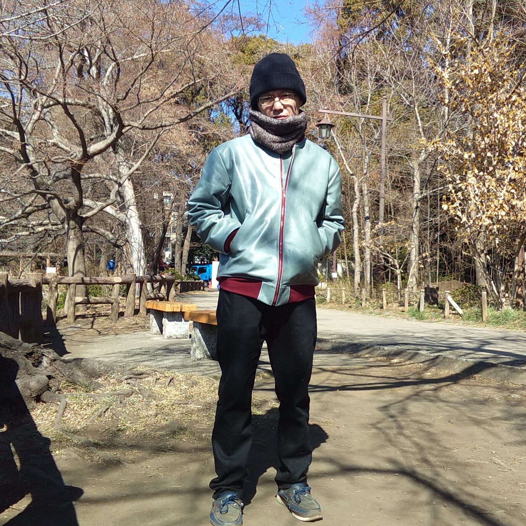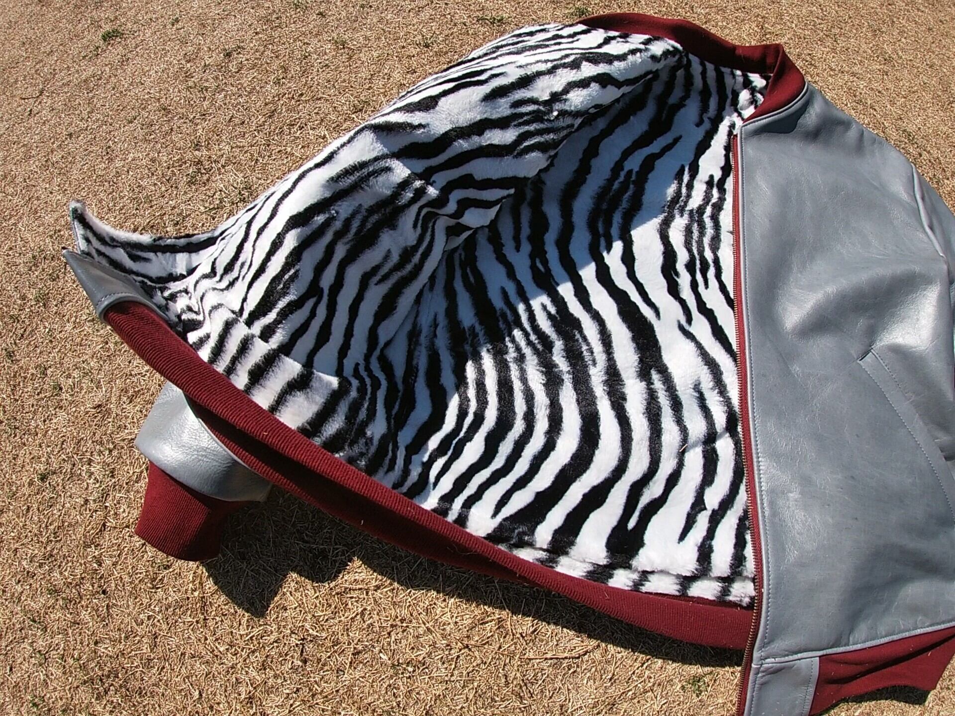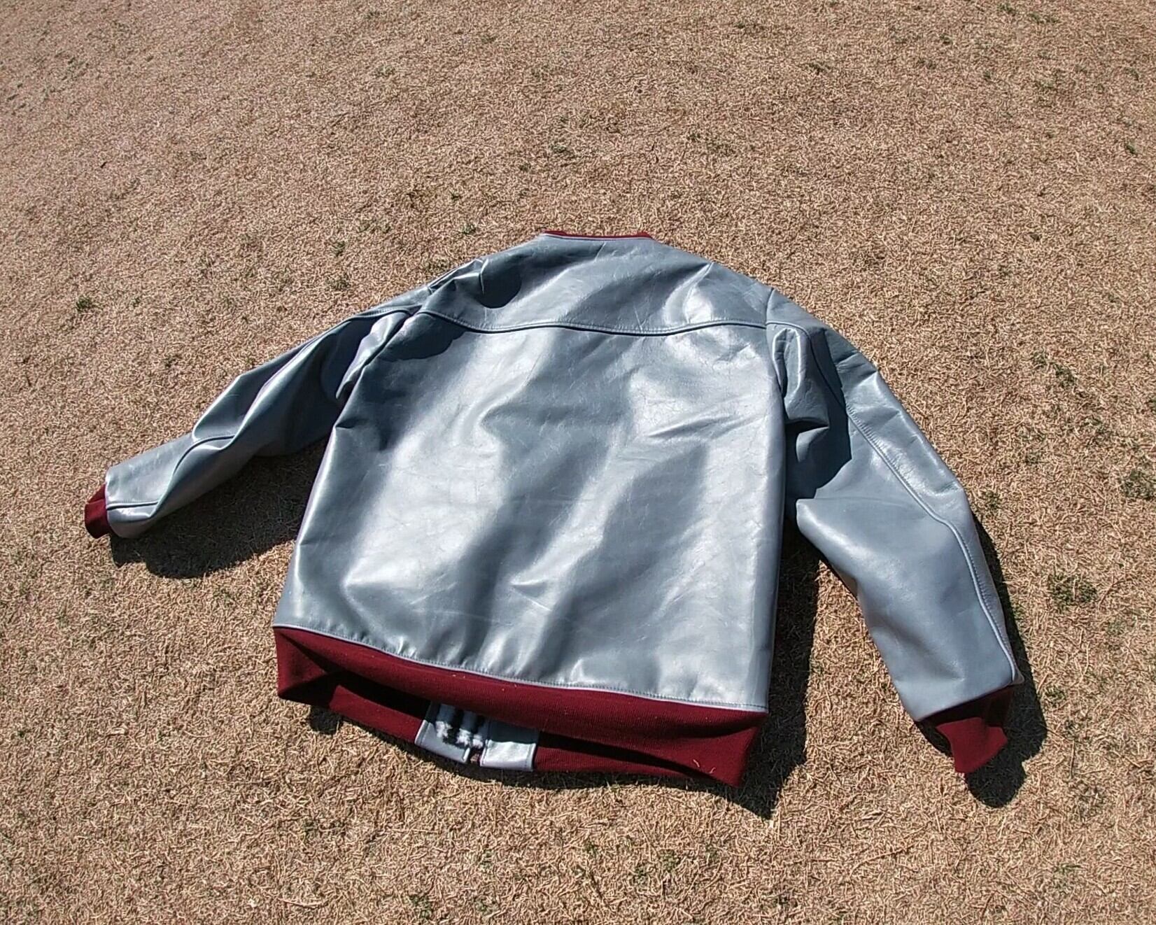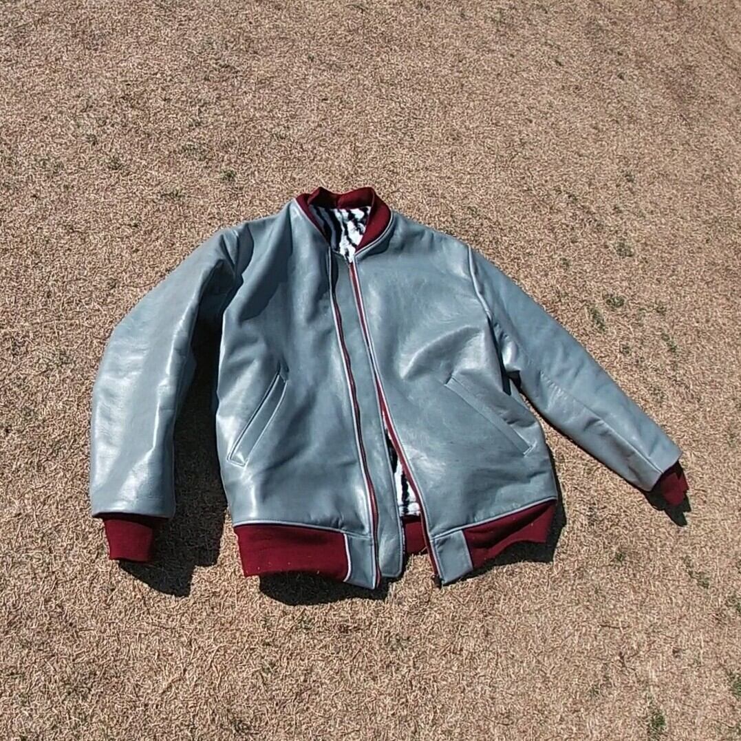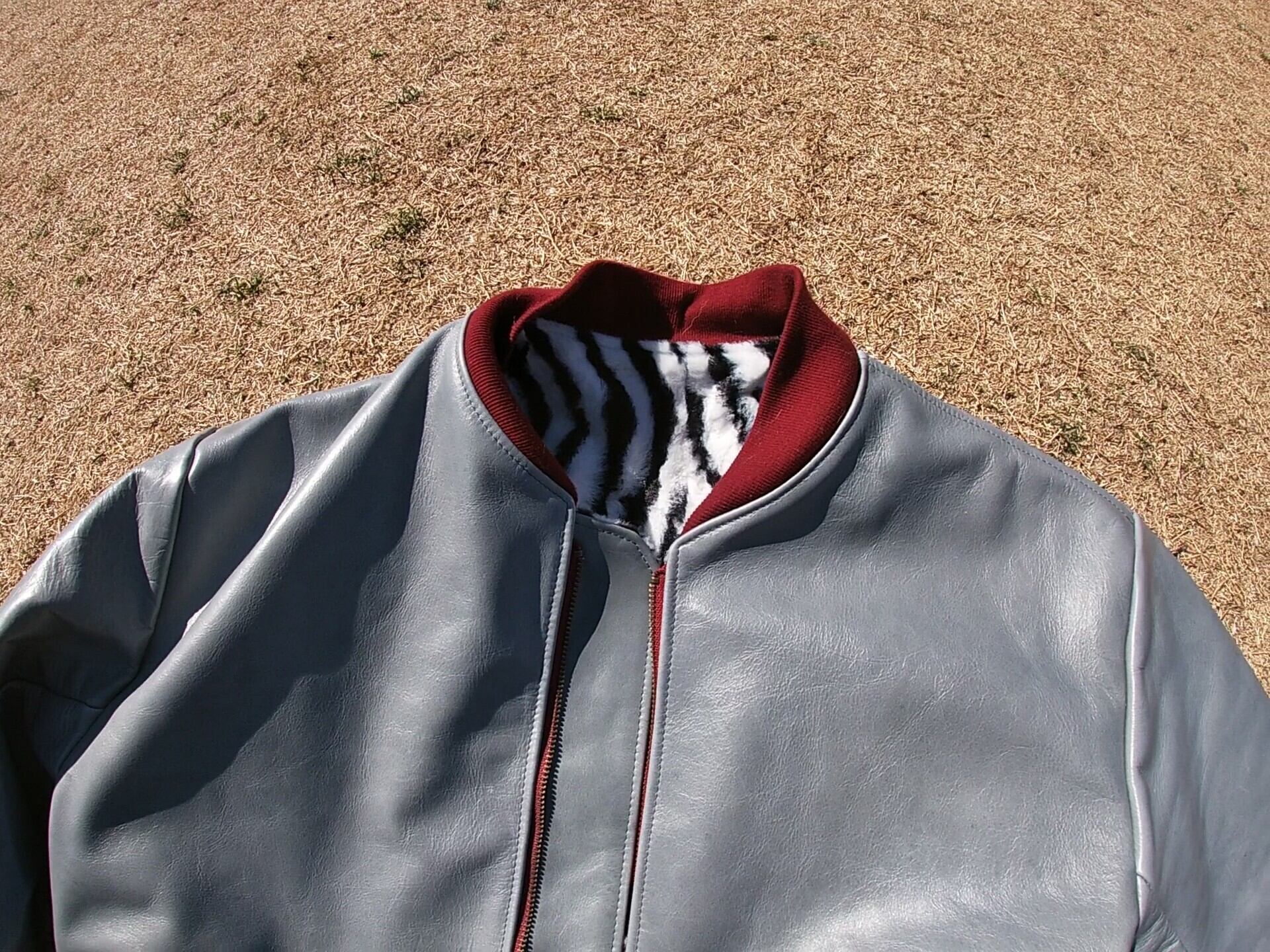 職業用ミシンを用いた、自身初の試みとなる革ジャケットの縫製。イタリアンレザーの牛革(ブルーグレー)にゼブラファーの裏地、更には袖襟裾に赤リブを組み合わせた独特なデザイン。