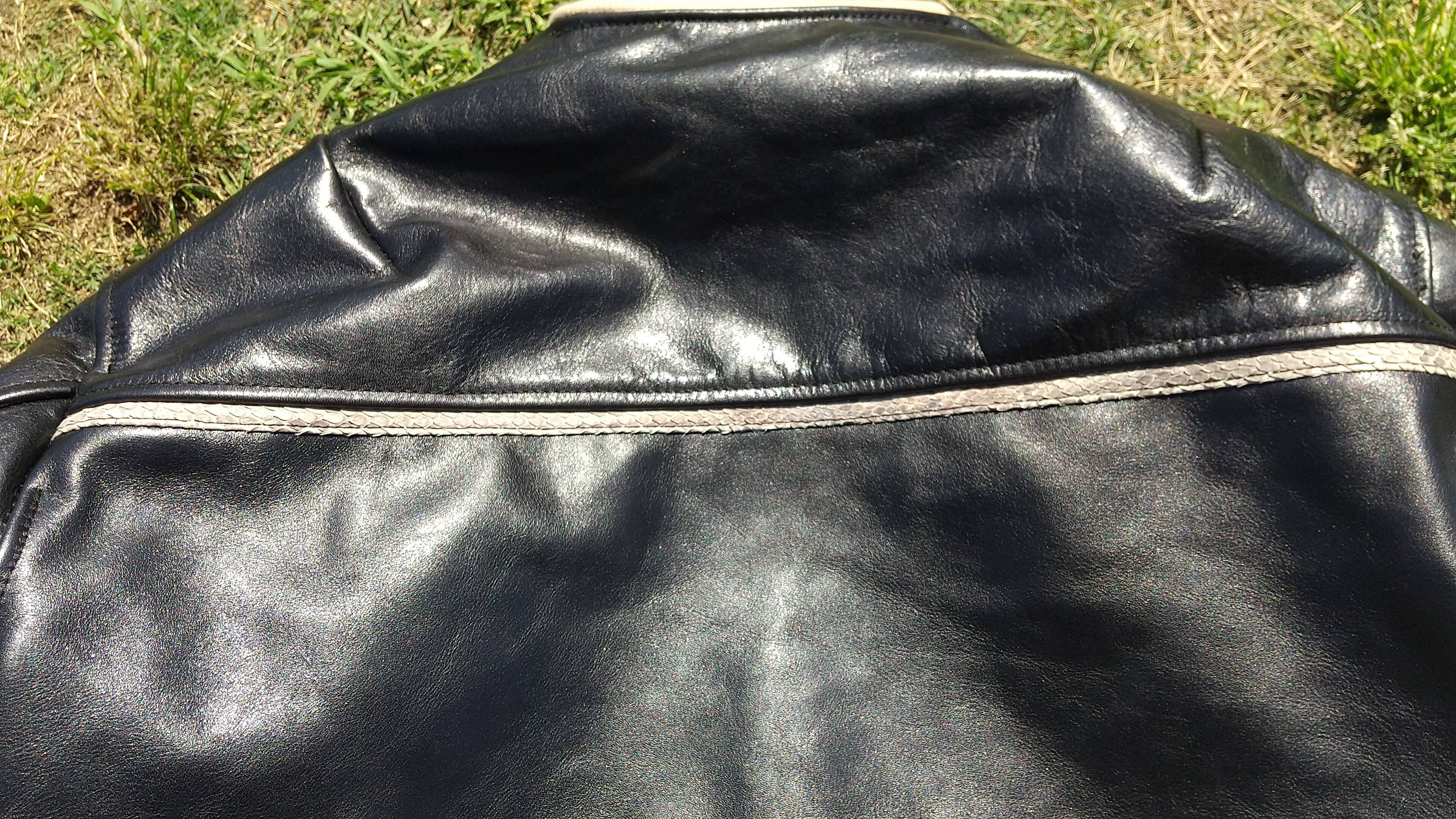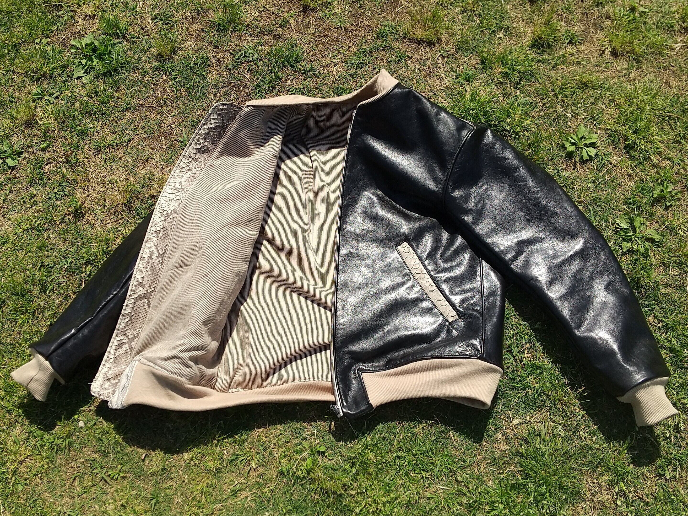 職業用ミシンを用いた、革ジャケットの縫製。牛革の表地とストライプの裏地、パイソン革をアクセントのデザインに用い、更には袖襟裾にベージュリブを組み合わせた独特なデザイン。
