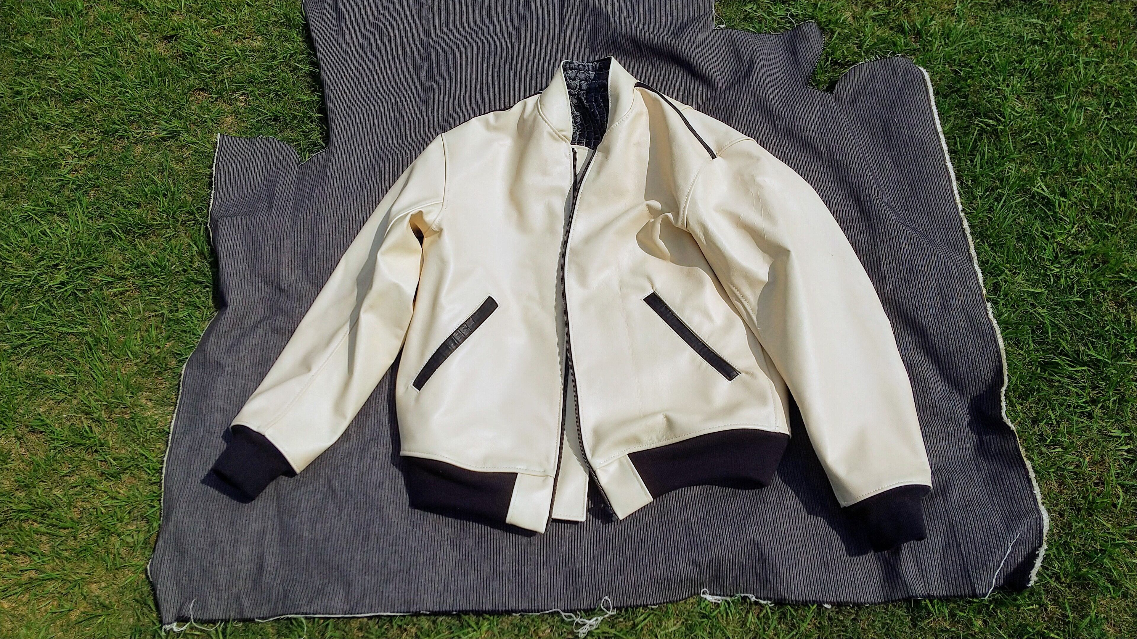 職業用ミシンを用いた、自主制作による革ジャケットの縫製。牛革の表地とストライプの裏地、クロコダイル革とデニムをアクセントのデザインに用い、更には袖襟裾にリブを組み合わせた独特なデザイン。ポケットの玉緑布や切返しのラインにはカイマンクロコダイル革を用い、圧倒的な個性と存在感を発する。このMA-1型を基調としたフライトジャケットには、ミルコ・クロコダイルと命名だ!
