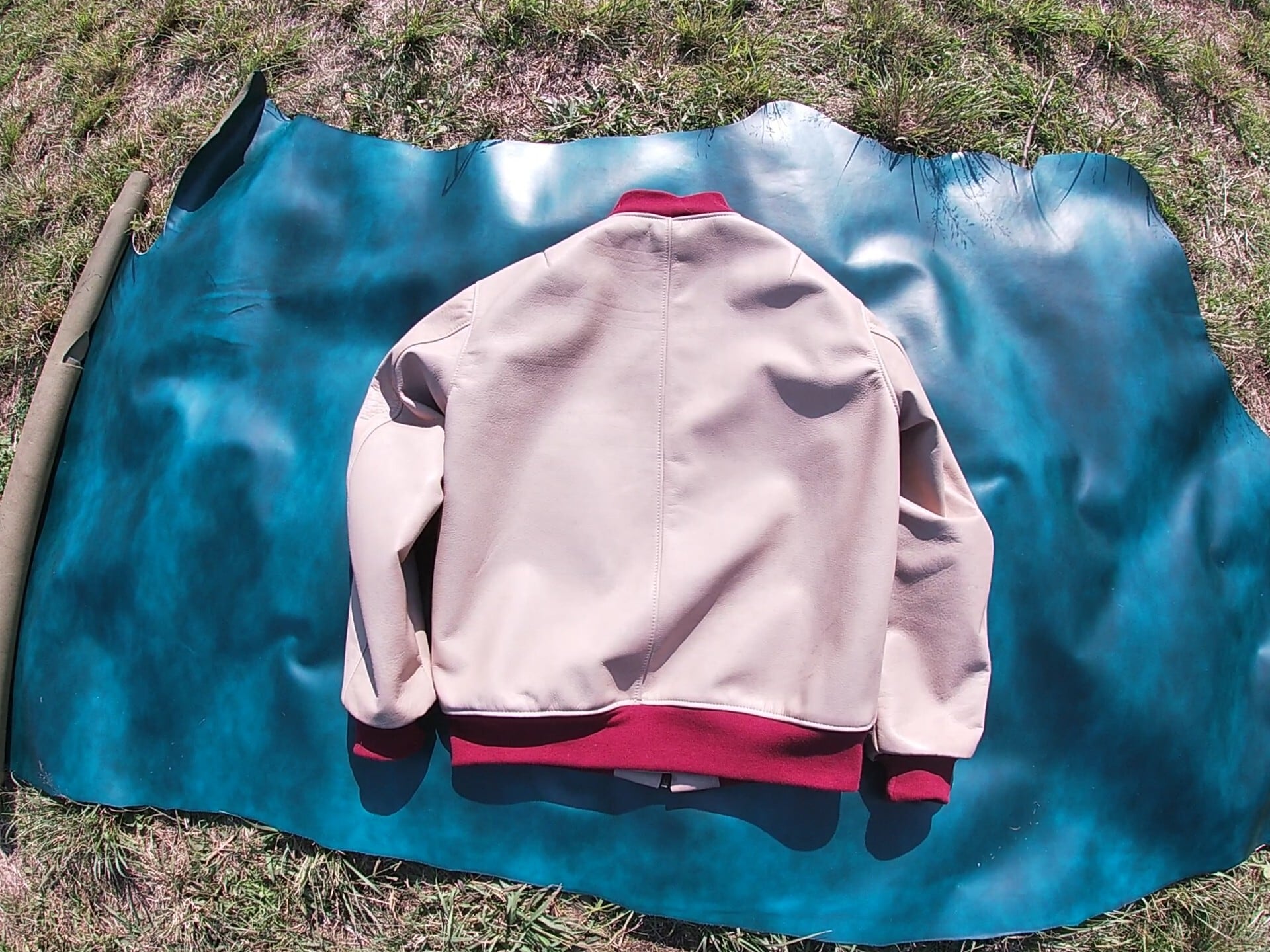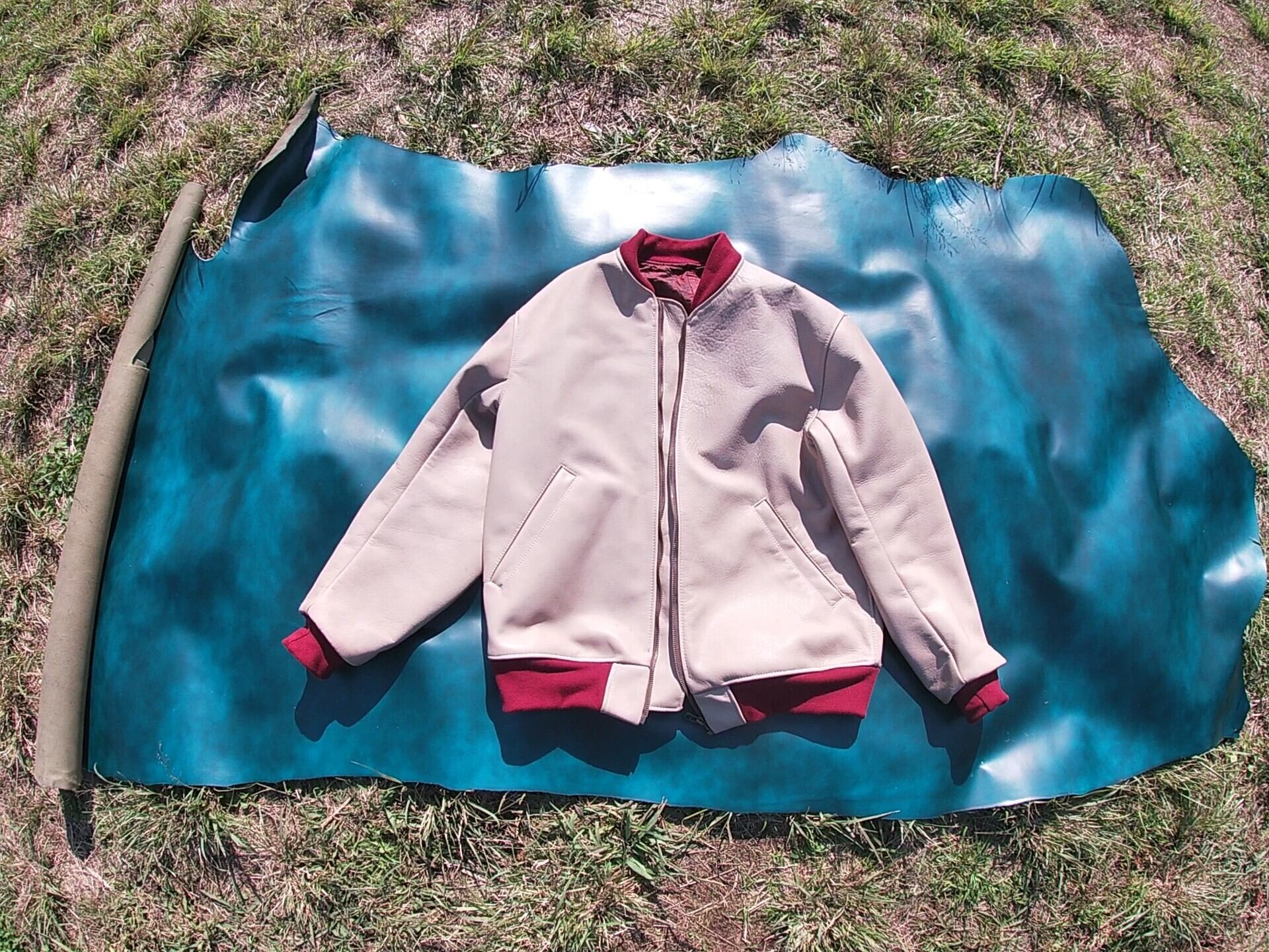 職業用ミシンを用いた、自主制作による革ジャケットの縫製。牛革の表地とダイヤステッチの裏地、袖襟裾にリブを組み合わせた、MA-1型を基調としたフライトジャケット。色使い、全体的なデザインにより、マロンと命名した。